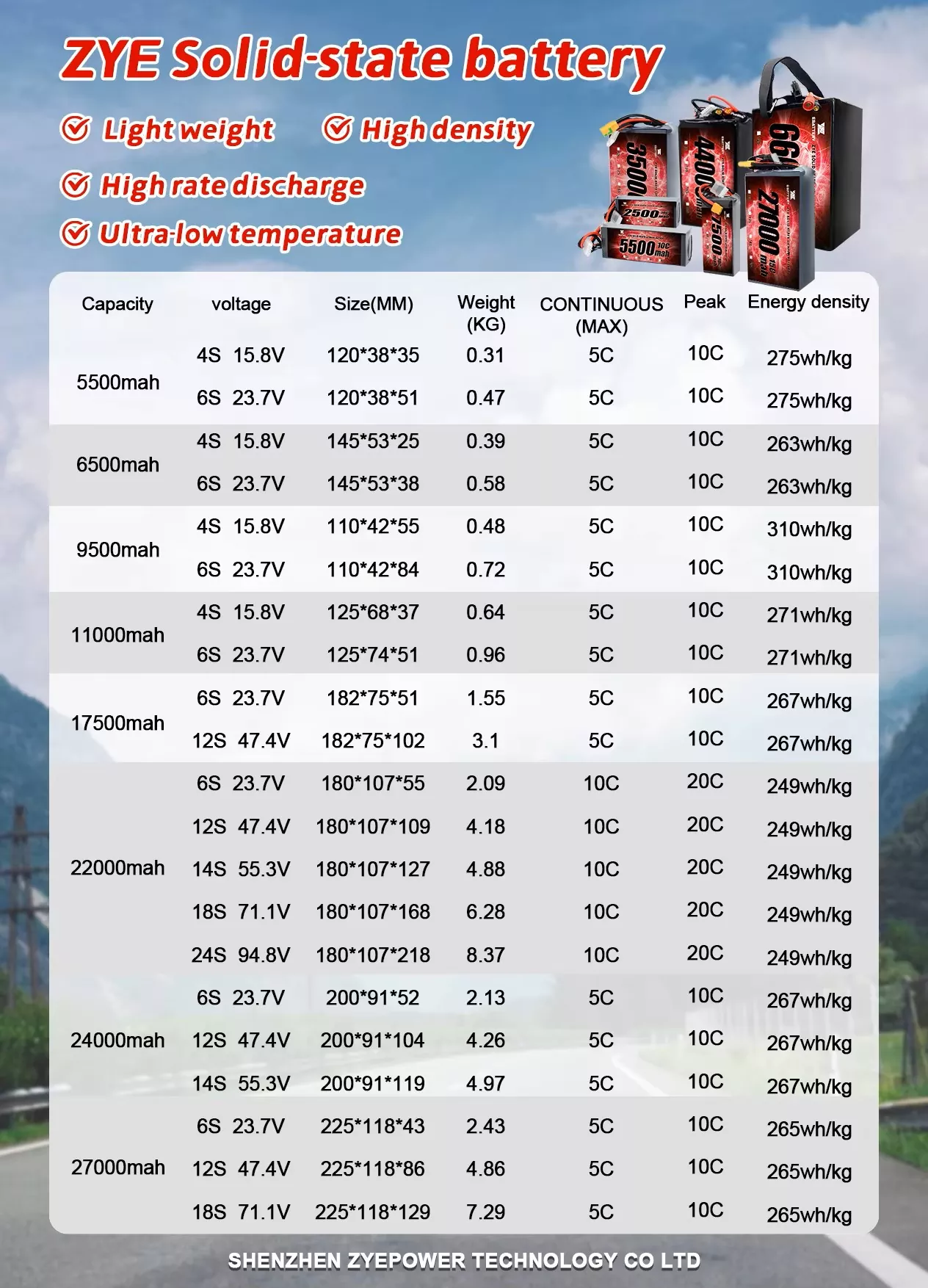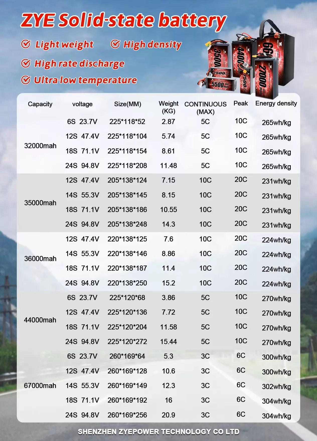 Zye High Energy Hustota Solid State Batéria vyrobená spoločnosťou Zye ako profesionálny výrobca má charakteristiky vysokej stability. Hľadáte vysoko výkonné batérie robotov? Zyebattery poskytuje vlastné balíčky v pevnom stave a lipo až do 24 s. Ideálne pre poľnohospodárstvo, dodávku a mapovanie UAV.